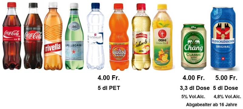 Unsere Getränk Auswahl umfasst eine Vielzahl an erfrischenden Optionen. Geniessen Sie aromatischen Tee, belebende Limonaden, Mineralwasser oder ein kühles Bier zum Mitnehmen.